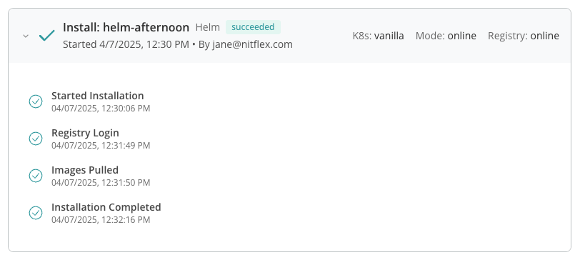 • For installations with Helm, the Enterprise Portal reports when your image registry was accessed and when application images were pulled, as shown below: Helm install attempt progress details