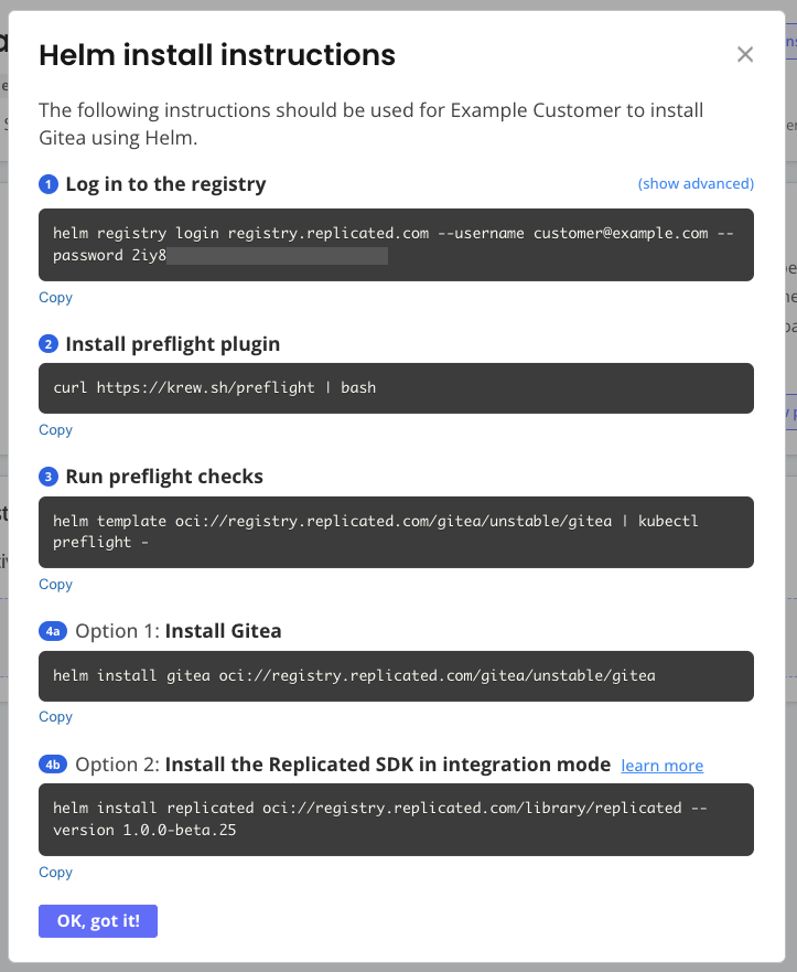 Get customer-specific installation instructions for Helm or Embedded Cluster